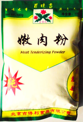 嫩肉粉,又稱松肉粉,這是一種能使動(dòng)物性原料軟嫩滑潤(rùn),同時(shí)又不損傷肌纖維彈性的佐助料,呈白色粉末狀,為純天然制品,它的主要成分是從番木瓜中提取的疏松劑木瓜蛋白酶,它能將動(dòng)物類原料結(jié)締組織、肌纖維中的膠原蛋白及彈性蛋白適當(dāng)分解,使部分氨基酸之間的連接鍵發(fā)生斷裂,從而破壞它們的分子結(jié)構(gòu),大大提高原料肉的嫩度,并使其風(fēng)味得到改善。