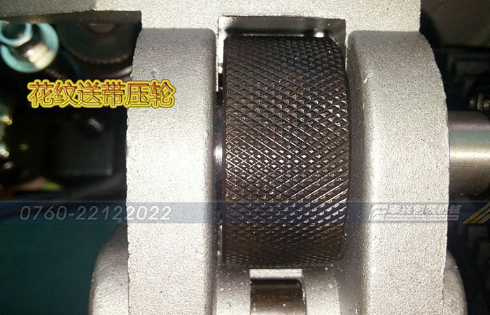 6、全新精工型半自動打包機(jī)上分機(jī)送帶壓輪表面帶花紋,增加了輪與帶之間摩擦力,使送帶更順暢;