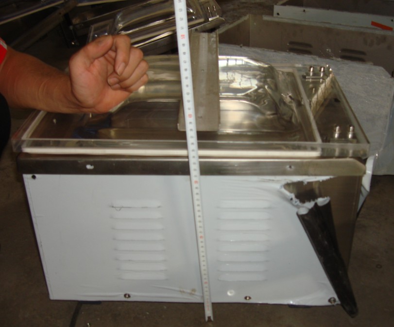 280臺(tái)式真空包裝機(jī)四分之三是不銹鋼外殼的一個(gè)箱體,四分之一是厚度26-28MM的有機(jī)玻璃拱形蓋子(往上弧度約35MM)。外形長50CM,寬34CM,高38CM(底部有4厘米腳架+橡膠墊腳,上部有厚的有機(jī)玻璃弧形蓋子,往上弧度弓起有大概3厘米)。整機(jī)重量約23公斤。