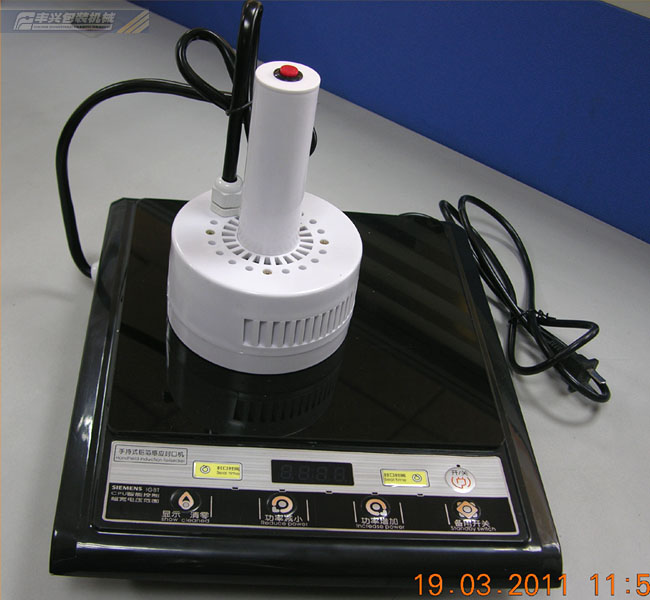 Electromagnetic induction sealing machine, a non-contact sealing process, the heat generated by electromagnetic induction moment, namely fusion of aluminum foil on the bottle, the process for most avoid being contaminated items of storage, the effective protection products, to avoid overturned splashing, squeeze the unexpected overflow.
