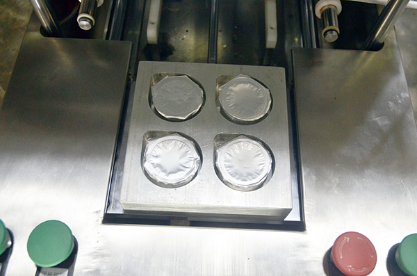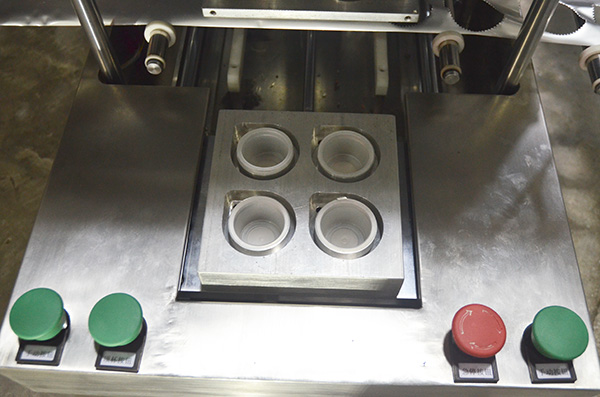 ① 四個模具加熱到設定溫度(根據(jù)環(huán)境溫度以及需要熱封的杯、膜材料不同,一般設定在120-180℃,初次使用時必須由低到高逐漸實驗,達到封口效果時記錄固定下來)
