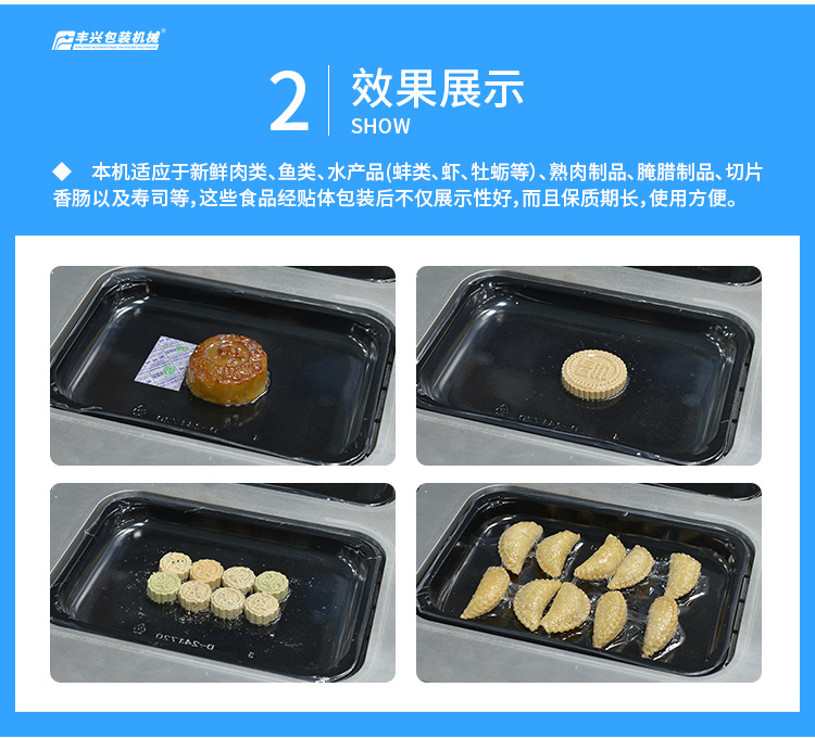 訂購熱線:0760-22122022FX-240T臺(tái)式真空貼標(biāo)包裝機(jī),原理是采用低溫復(fù)合膜,將物料放在下模板的托盒或膜上,在真空狀態(tài)下利用真空吸力將透明貼體包裝膜順應(yīng)產(chǎn)品形狀覆蓋在產(chǎn)品表面及塑料托盤上,適應(yīng)于新鮮肉類、魚類、水產(chǎn)品(蚌類、蝦、牡蠣等)、熟肉制品、腌臘制品、切片香腸以及壽司等;包裝具有使食品保鮮、保質(zhì)、保色、保型、保味的特點(diǎn);這些食品經(jīng)貼體包裝后不僅展示性好,而且保質(zhì)期長(zhǎng),使用方便。歡迎大家咨詢!
