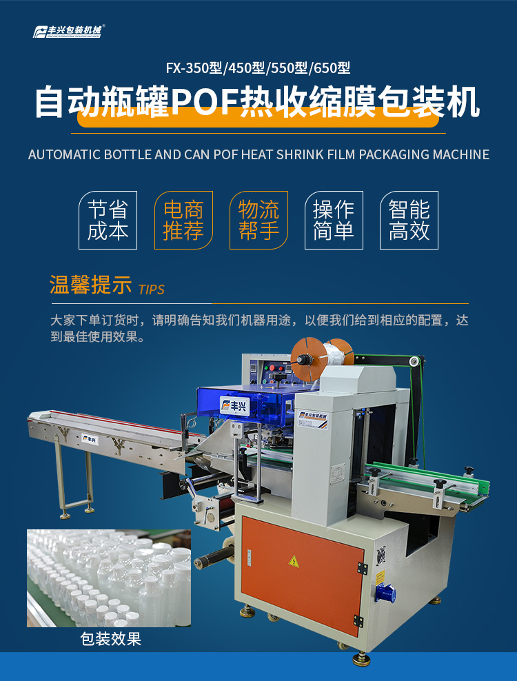 專為瓶罐灌裝生產線設計!本機采用皮帶輸送進料結構,確保酒瓶、飲料罐、化妝品瓶、打印墨水瓶等方瓶、圓瓶直立運行,進入熱收縮膜包裹區(qū)間,實現(xiàn)完美貼合瓶身,讓產品呈現(xiàn)光滑的曲線,提高展示檔次。垂直旋轉式封切刀,精準裁切無毛邊,切口平整光滑。目前有滿足最小10ml以上的多種規(guī)格機型供選擇。單瓶、多瓶組合包裝,一鍵設置,輕松打造吸睛促銷裝、禮盒裝。